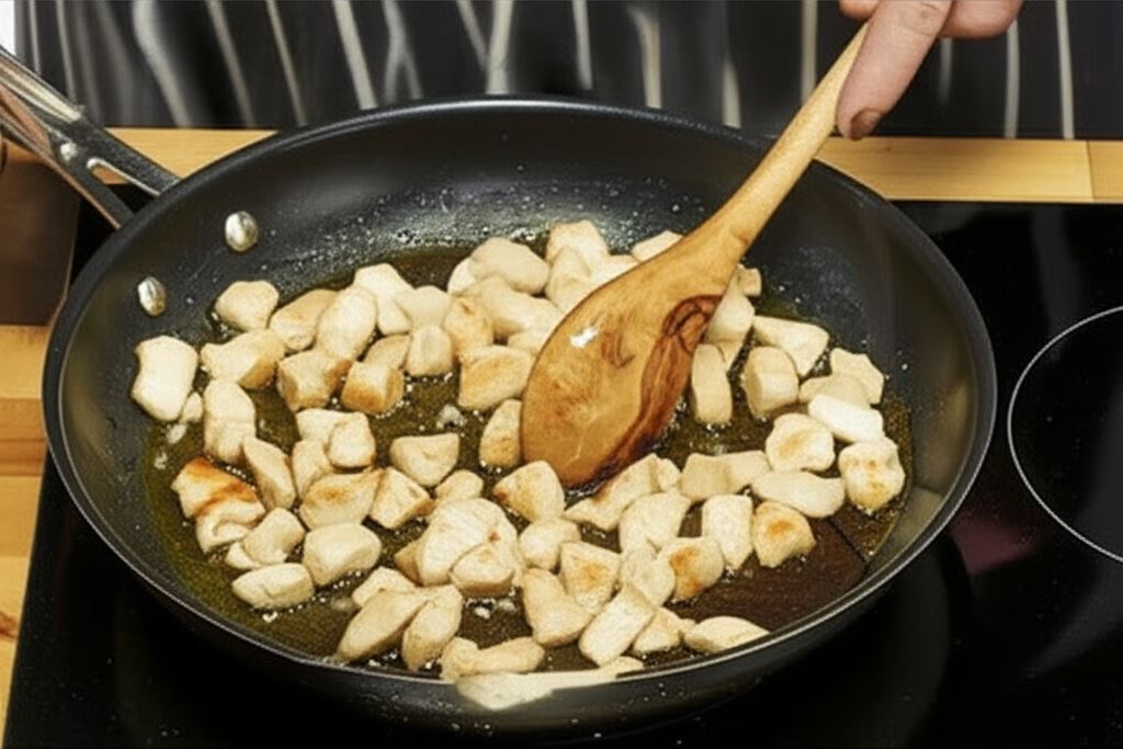 Przyrumień kurczaka na 1 łyżce rozgrzanej oliwy do zrumienienia (3-4 min). Dorzuć cukinię i kontynuuj smażenie na średnim ogniu przez 3-4 min.
