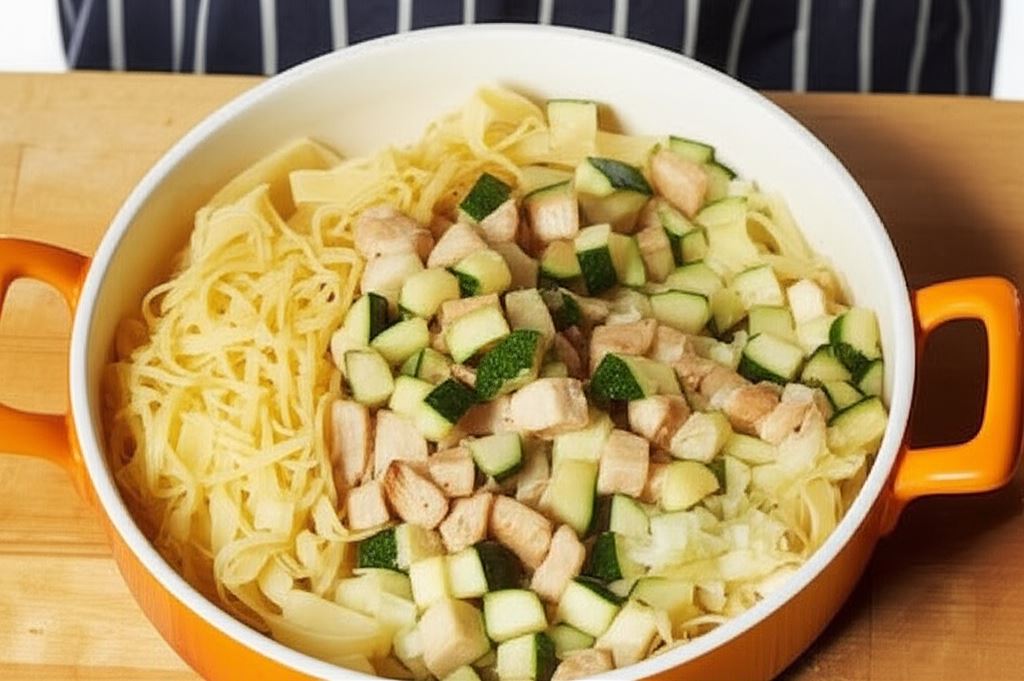 Połącz makaron z kurczakiem, serem, cukinią i szczypiorkiem.
