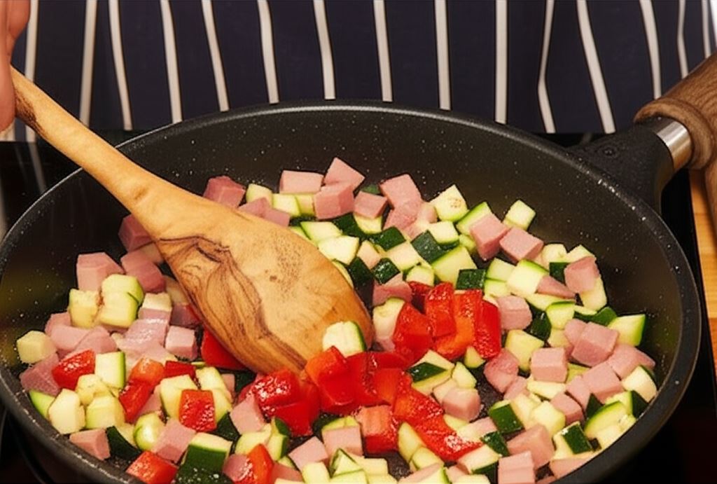 Pokrój szynkę w kostkę. Pokrój cukinię i paprykę. Posiekaj drobno czosnek i zrumień go na 1 łyżce rozgrzanej oliwy, aż zacznie aromatyzować. Dodaj szynkę i smaż przez 2 min. Dorzuć warzywa i smaż nadal na średnim ogniu przez 3-4 min.