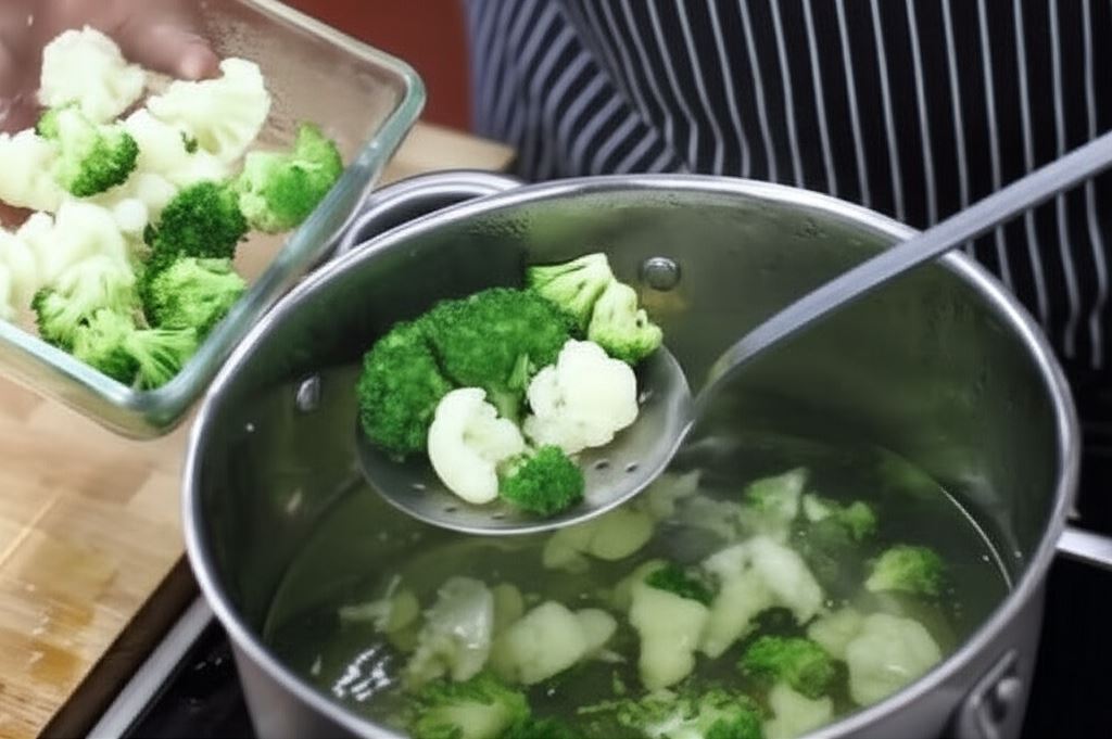 Warzywa podziel na różyczki i zblanszuj w gorącej wodzie pilnując, by nie były zbyt miękkie. Odlej wodę.