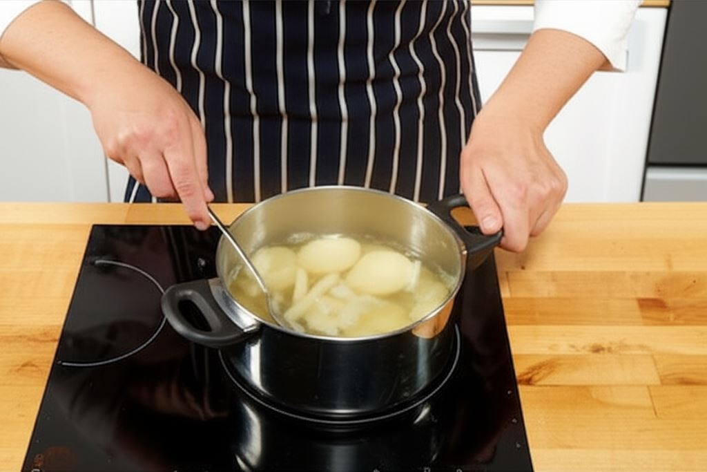 Rozgrzej piekarnik do 180°C. Wysmaruj naczynie do zapiekania margaryną. Pokrój ziemniaki na cienkie plasterki. Gotuj ziemniaki przez 5 min. w gotującej się wodzie. Odcedź i następnie przepłucz ziemniaki zimną wodą. Posiekaj czosnek i tymianek. Zetrzyj ser na tarce.