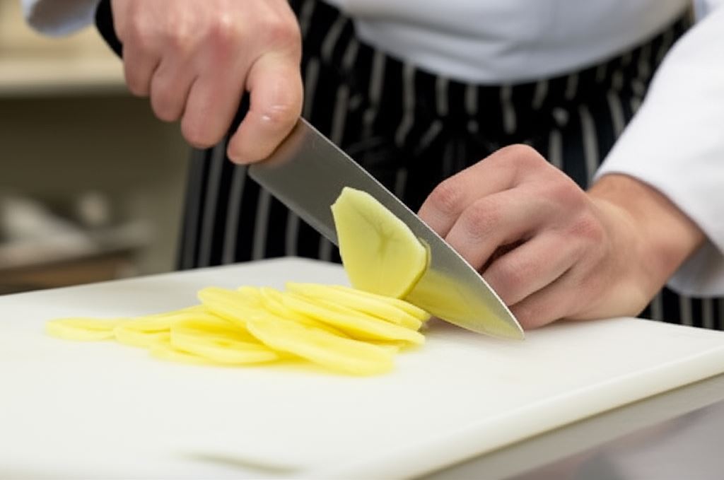 Ziemniaki obierz, przepłucz wodą i potnij w cienkie plastry nożem lub np. maszynką do szatkowania warzyw.