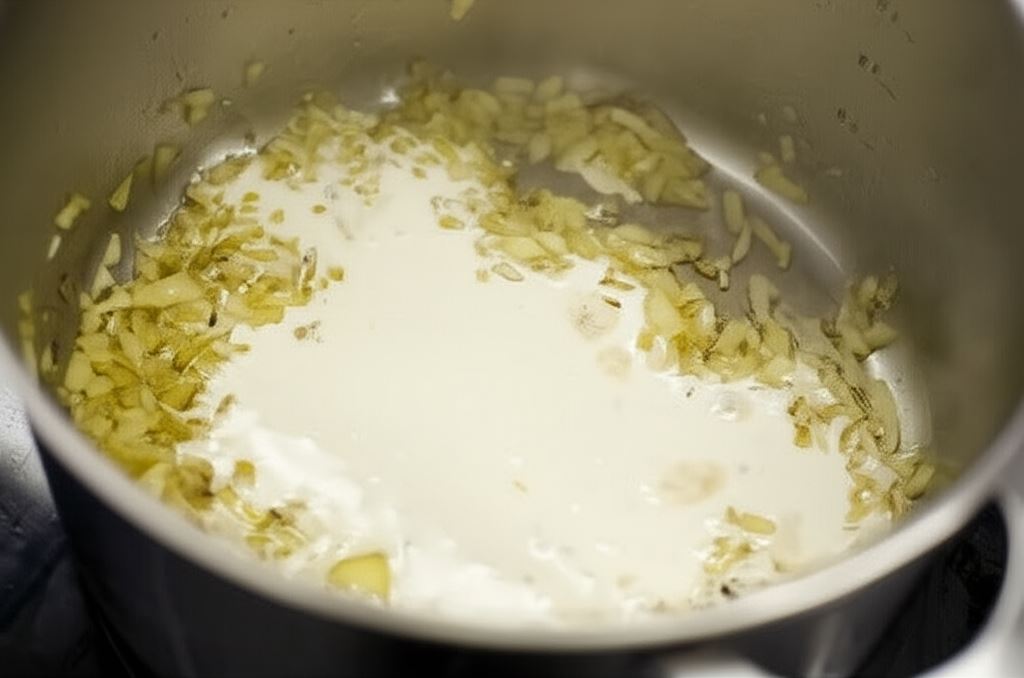 Cebulę i czosnek posiekaj i zrumień w garnku. Gdy nabiorą koloru, dodaj śmietanę i doprowadź mieszankę do wrzenia.