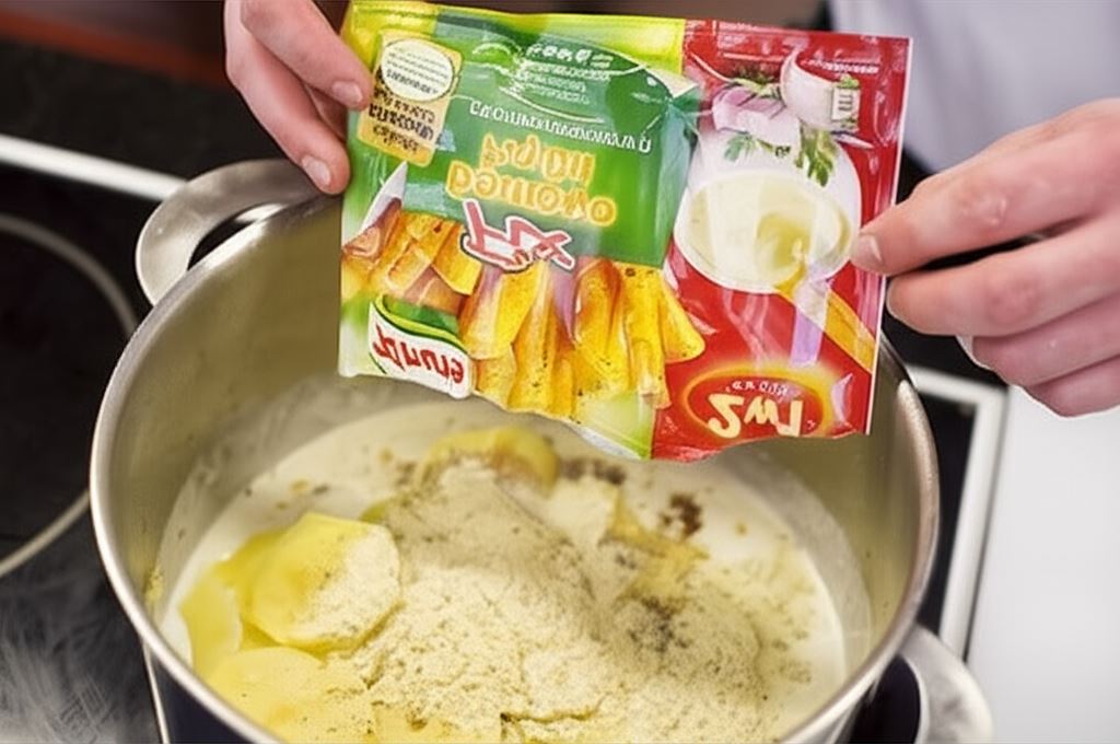 Do wrzącej śmietany wsyp ziemniaki, gałkę muszkatołową i Knorr.