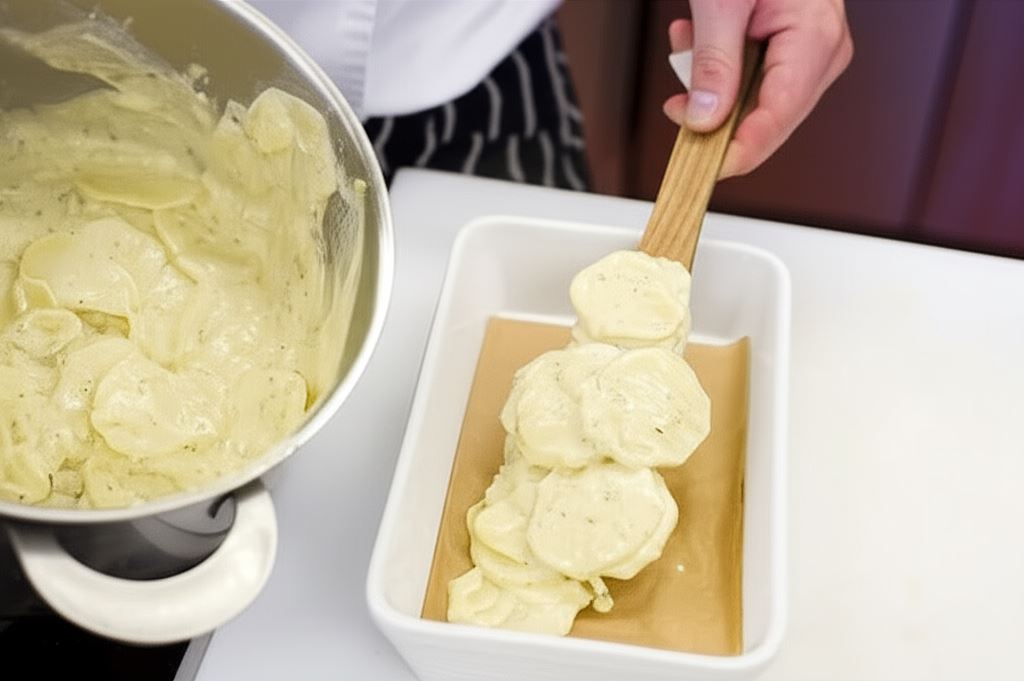 Formę żaroodporną wyłóż papierem do pieczenia. Przelej ziemniaki z sosem i przy pomocy łopatki wyrównaj masę w naczyniu.