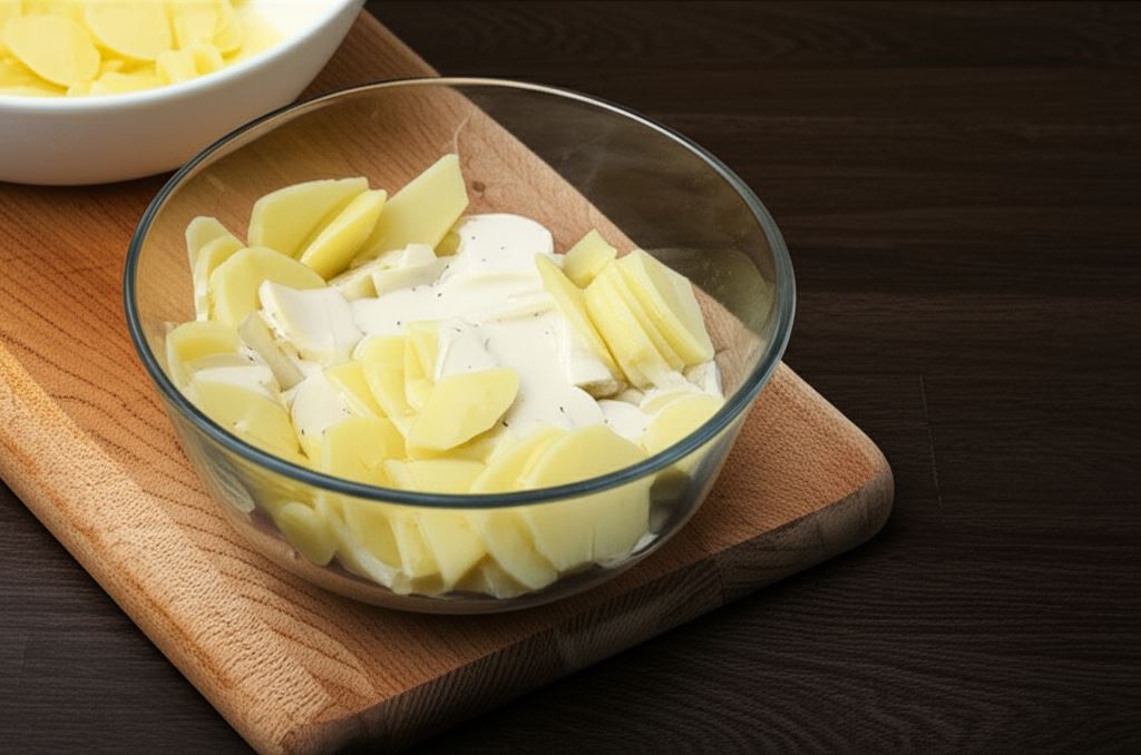 Obierz ziemniaki i pokrój je na cienkie plastry. Wymieszaj śmietanę z dipem czosnkowym Knorr i dołącz do ziemniaków.