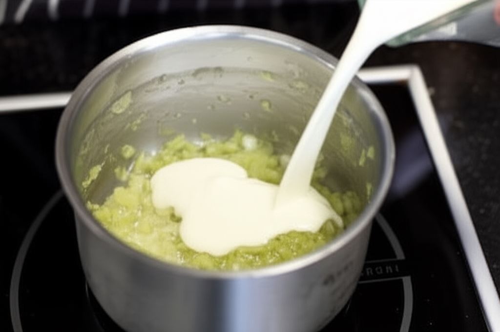 W rondlu zrumień posiekaną jedną cebulę, wlej śmietanę. Sos gotuj przez 3 minuty. Przypraw według smaku.