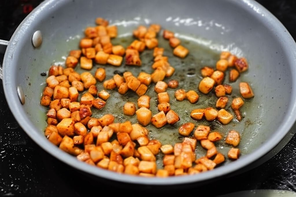 Cebulę i kiełbasę potnij w kostkę i przysmaż na gorącym oleju, aż uzyskają rumianą barwę, przypraw słodką papryką i przyprawą płatki chili z wędzoną papryką Knorr.