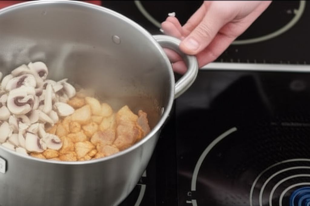 Mięso i pieczarki potnij w kostkę, posyp przyprawą Knorr i przysmaż w garnku. Pełniejszy smak otrzymasz, jeśli dodasz również pokrojony w drobną kostkę boczek.