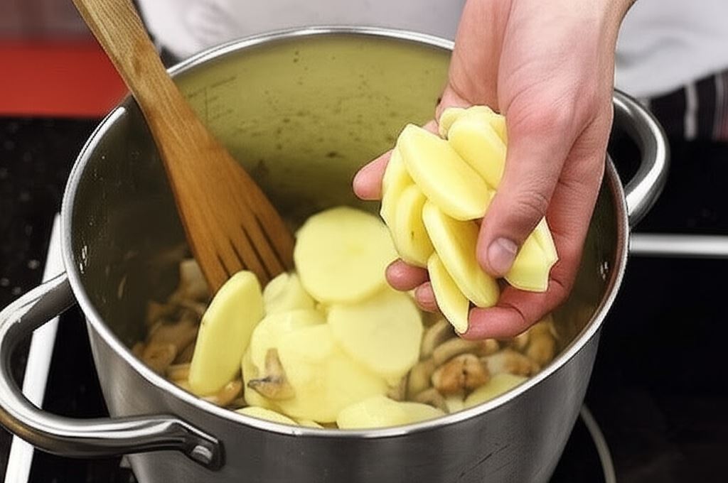 Ziemniaki obierz, potnij na plastry, wrzuć do garnka i krótko przysmaż. Wlej śmietanę i zupę Knorr, po czym całość doprowadź do wrzenia.