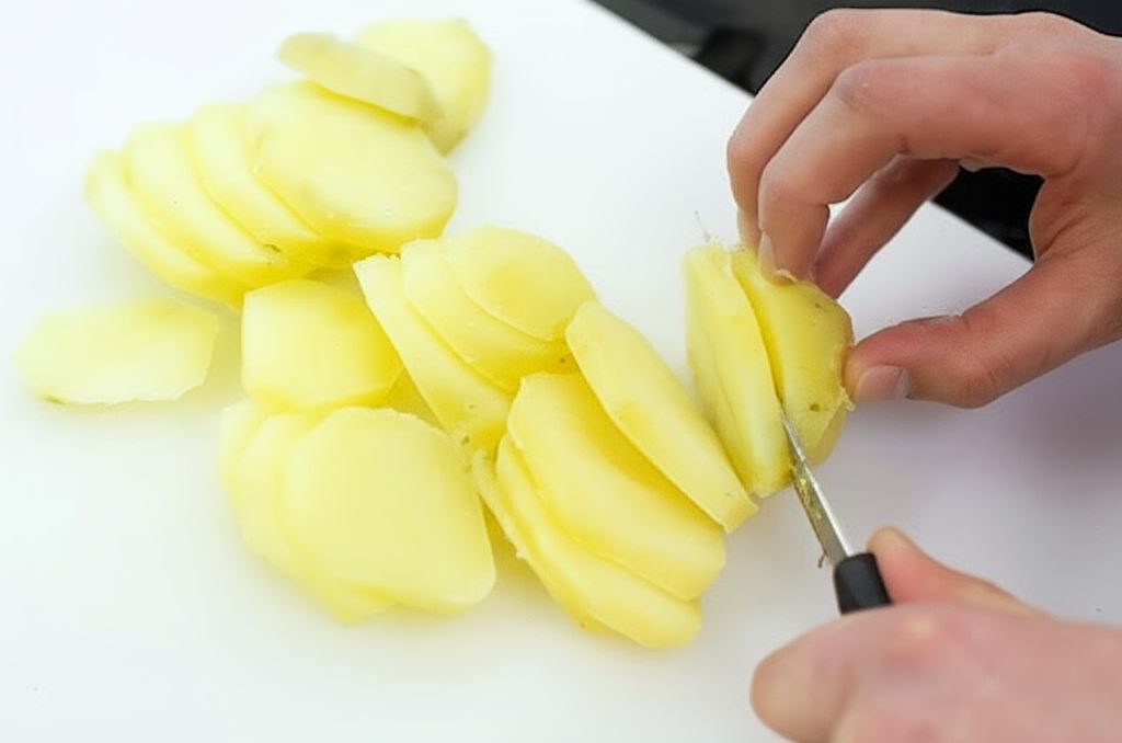 Ugotuj ziemniaki w mundurkach. Zdejmij skórkę i pokrój na plasterki.