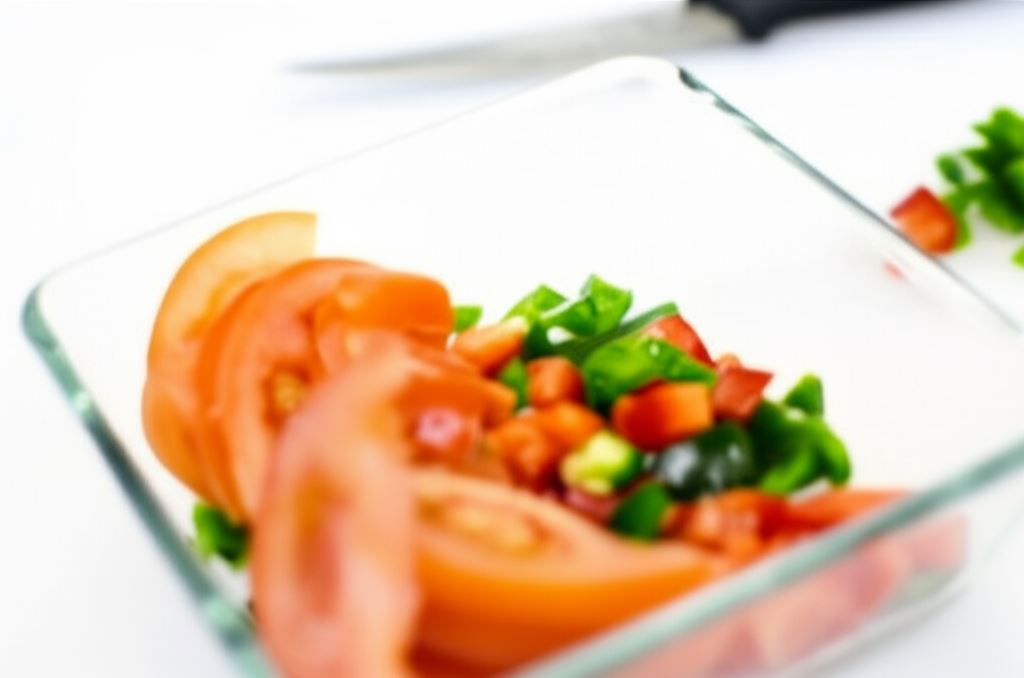 Paprykę pokrój w kosteczkę, a pomidory na plasterki.