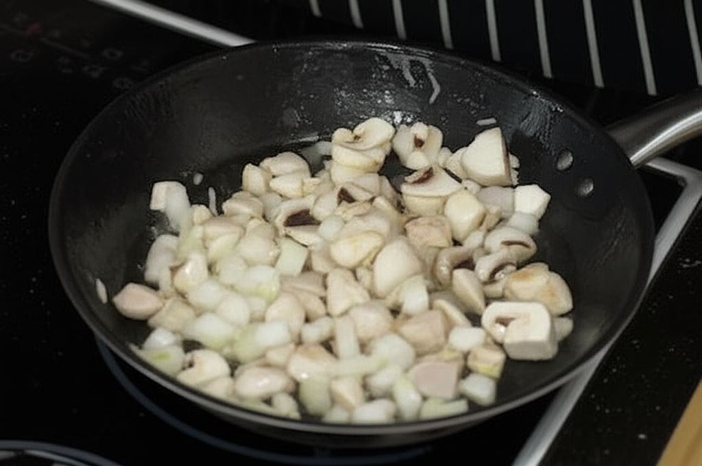 Piersi potnij w kostkę 1x1 cm i przyrumień na patelni. Pieczarki i cebulę pokrój na drobniejsze kawałki, dorzuć do kurczaka i smaż przez moment razem.