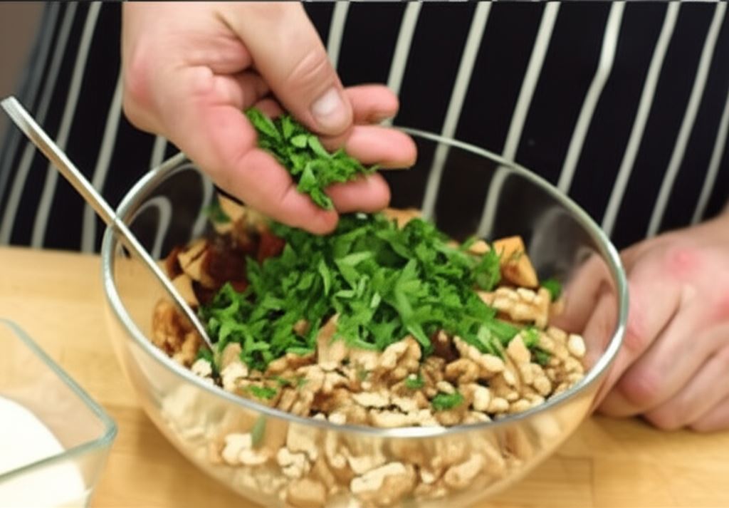 W naczyniu wymieszaj kurczaka z pieczarkami oraz ugotowaną kaszą, wsyp pokrojone pomidory, orzechy, posiekaną natkę i pieprz. Wlej śmietanę i zamieszaj.
