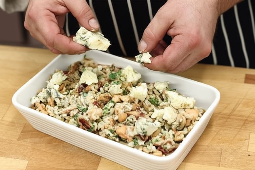 Zapiekany pęczak z kurczakiem, serem pleśniowym i orzechami
