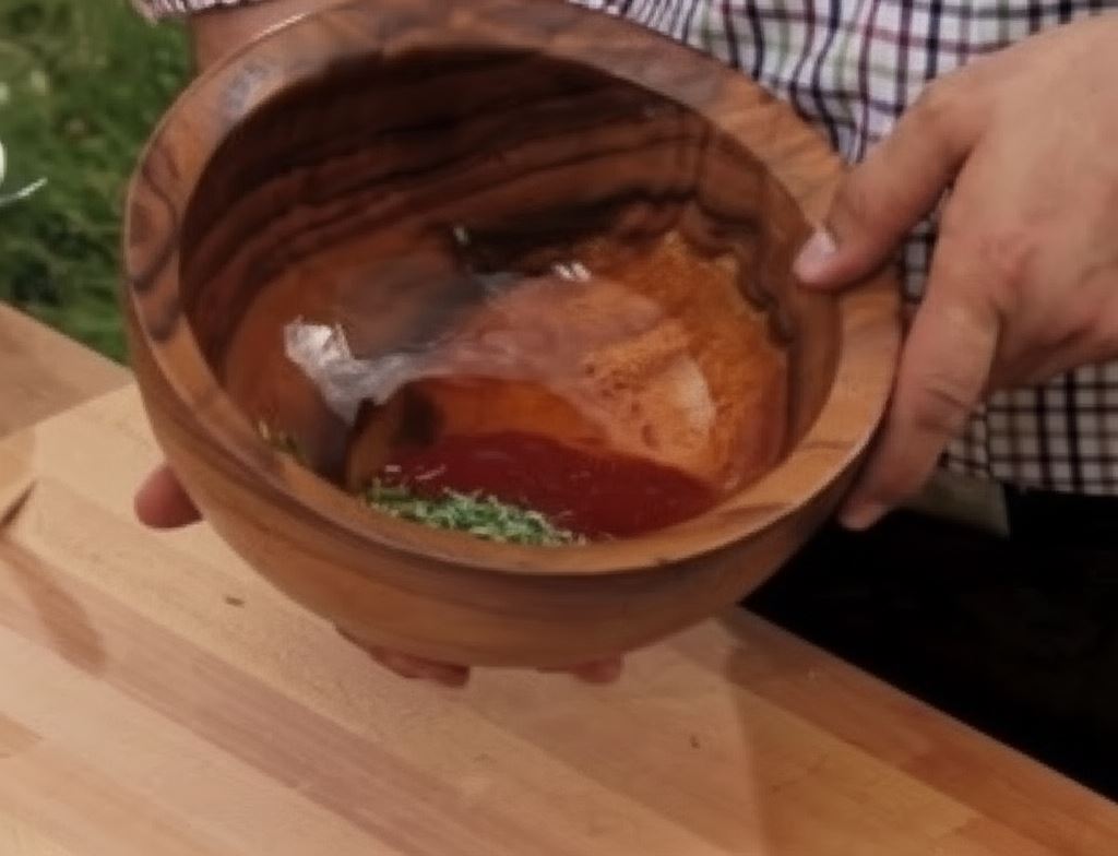 W misce wymieszaj kostkę rosołową Knorr z oliwą i ketchupem, dodaj posiekane igiełki rozmarynu.