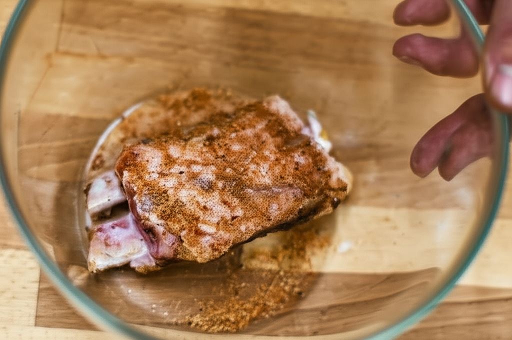 Żeberka podziel na mniejsze kawałki, na przykład w porcje po 6 kostek. Posyp przyprawą do karkówki, odłóż na bok na około 6 godzin, po czym piecz je w temperaturze 180 °C przez 120 minut. Odlej płyn wytworzony podczas pieczenia, żeberka odstaw do ostygnięcia.