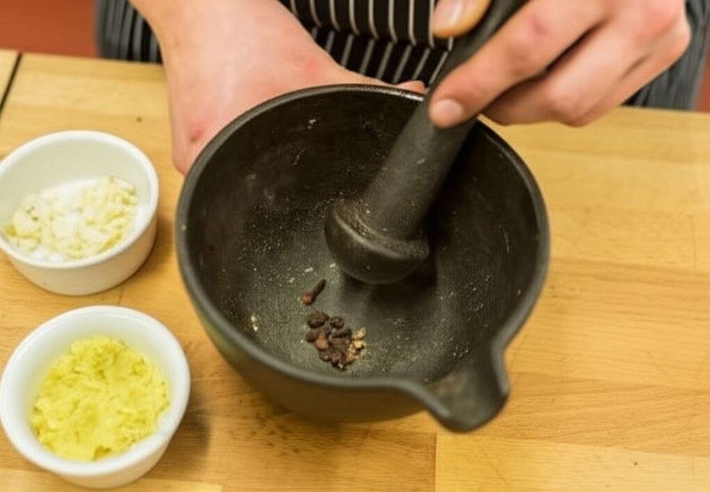 Goździki, pieprz czarny i ziele angielskie rozgnieć na pastę w moździerzu lub zmiel w młynku. Imbir obierz, zetrzyj na tarce. Czerwoną cebulę posiekaj w drobną kostkę. Czosnek i chili drobno posiekaj.