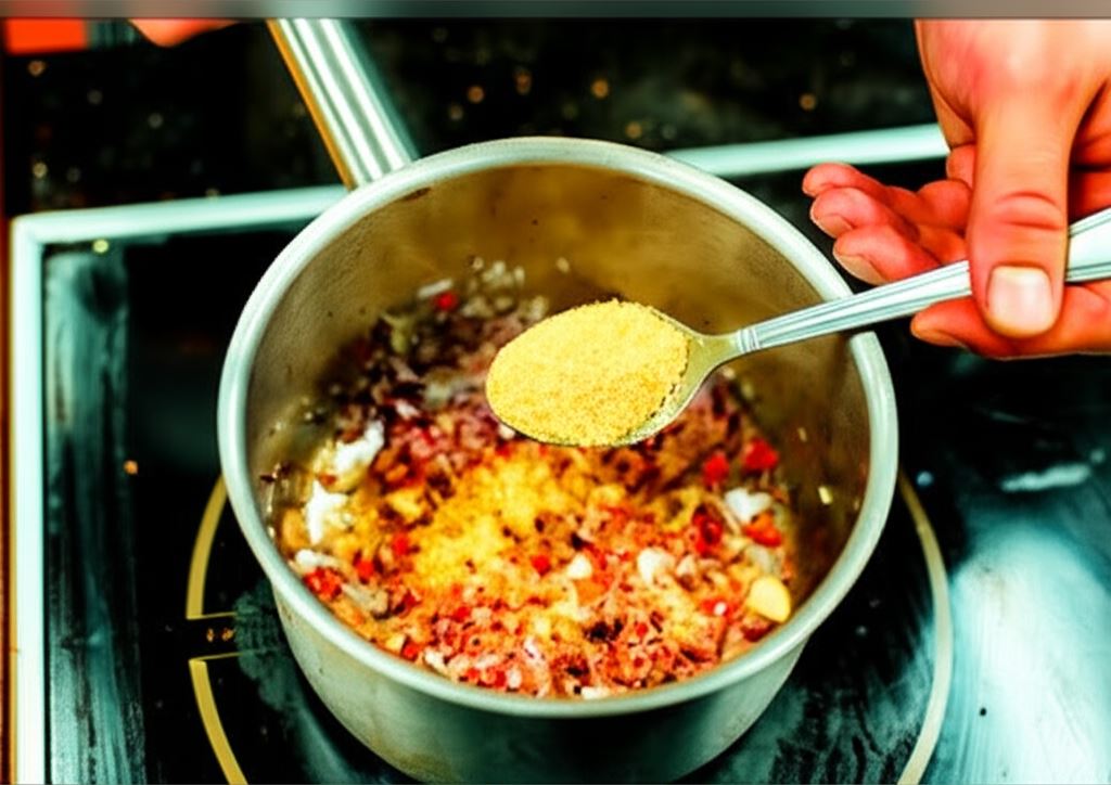 W garnku zrumień cebulę. Dorzuć do niej czosnek i chili i smaż, aż się zeszkli. Potem wsyp cukier i smaż dalej, dopóki cukier nie zacznie się karmelizować i uzyska ciemnobrązowy kolor. Wsyp wtedy przyprawy (kmin, ziele, pieprz, goździki) i wszystko razem smaż moment, zalej octem i płynem z pieczenia, wrzuć suszone śliwki. Gotuj całość razem, aż ocet prawie wyparuje. Na końcu dodaj ketchup.