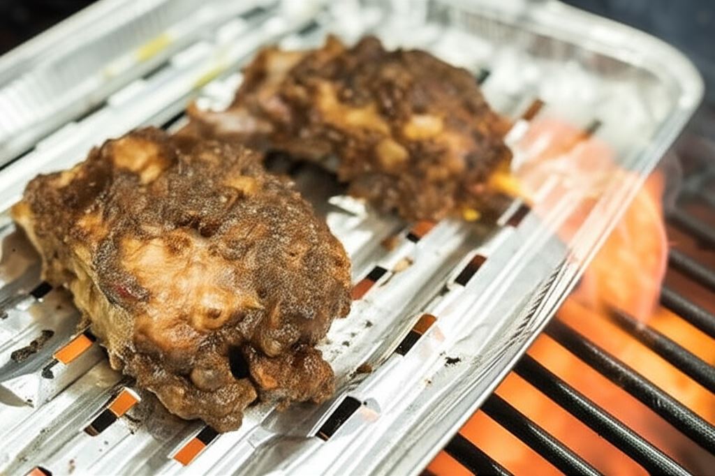 Mięso grilluj na aluminiowych tackach na średnio nagrzanym grillu pod pokrywą przez około 20 minut, obracając mięso od czasu do czasu. Żeberka powinny być przyrumienione na powierzchni i bardzo delikatne, aby można było bez trudu wyciągnąć kości.