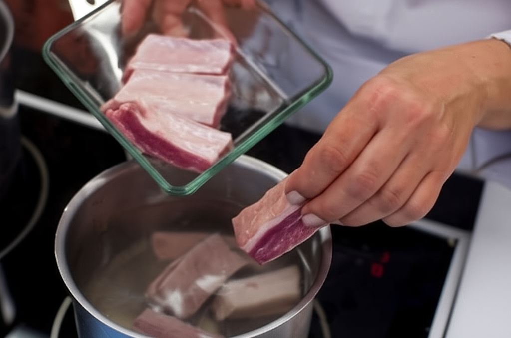 Żeberka opłucz i podziel na pojedyncze kawałki. Gotuj do miękkości w garnku w osolonej wodzie z przyprawami (ziele angielskie, liść laurowy, ziarna pieprzu).