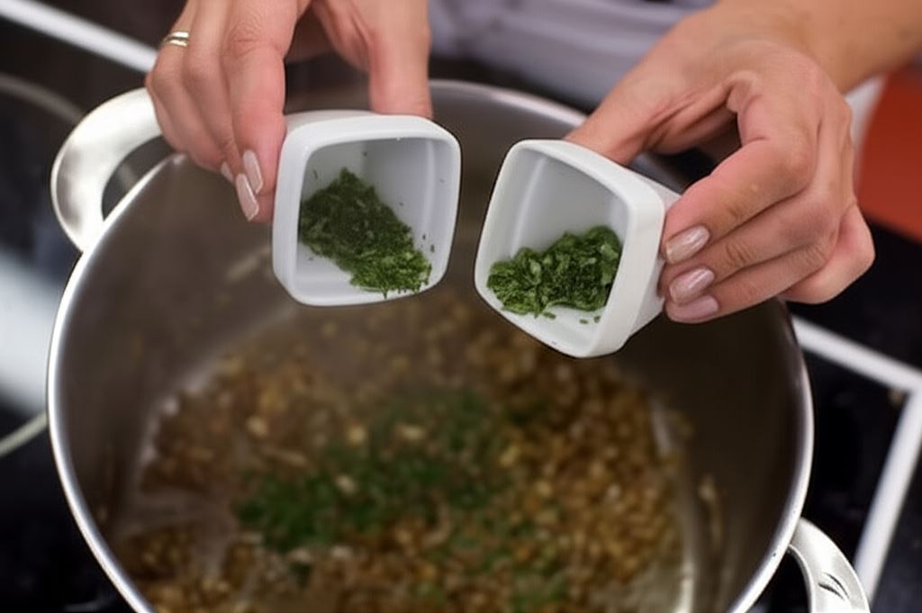 Czosnek i cebulę pokrój w małą kostkę. Połowę czosnku zrumień w garnku na oleju z cebulą, imbirem, cynamonem, gałką oraz tymiankiem i rozmarynem (drugą część czosnku odstaw na bok).