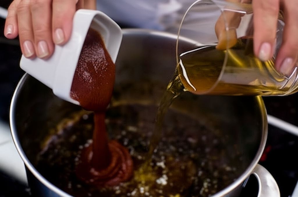 Zredukuj ocet o połowę podczas gotowania. Dodaj ketchup oraz whisky.
