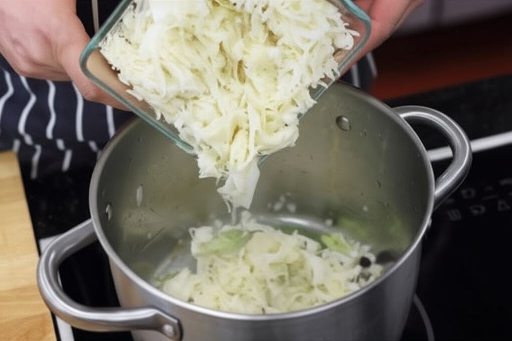 Cebule posiekaj w kostkę i przesmaż w garnku. Wsyp pokrojoną kapustę oraz ziele, liść i pieprz.