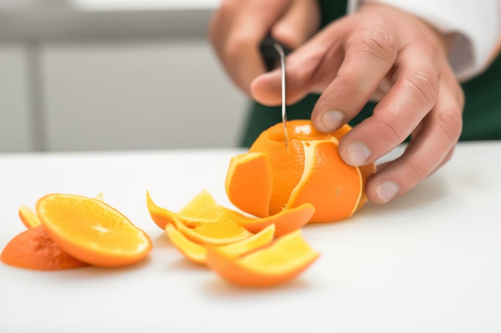 Pomarańczę oczyść z białych błonek, podziel na drobniejsze części.