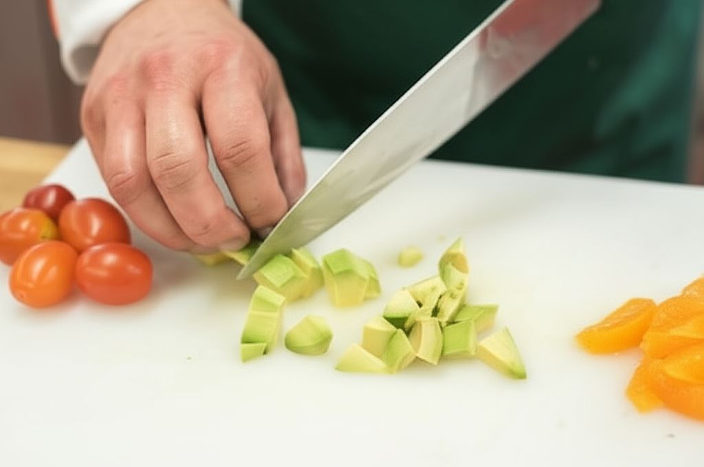 Awokado potnij w kostkę. Pomidorki przekrój na połówki.