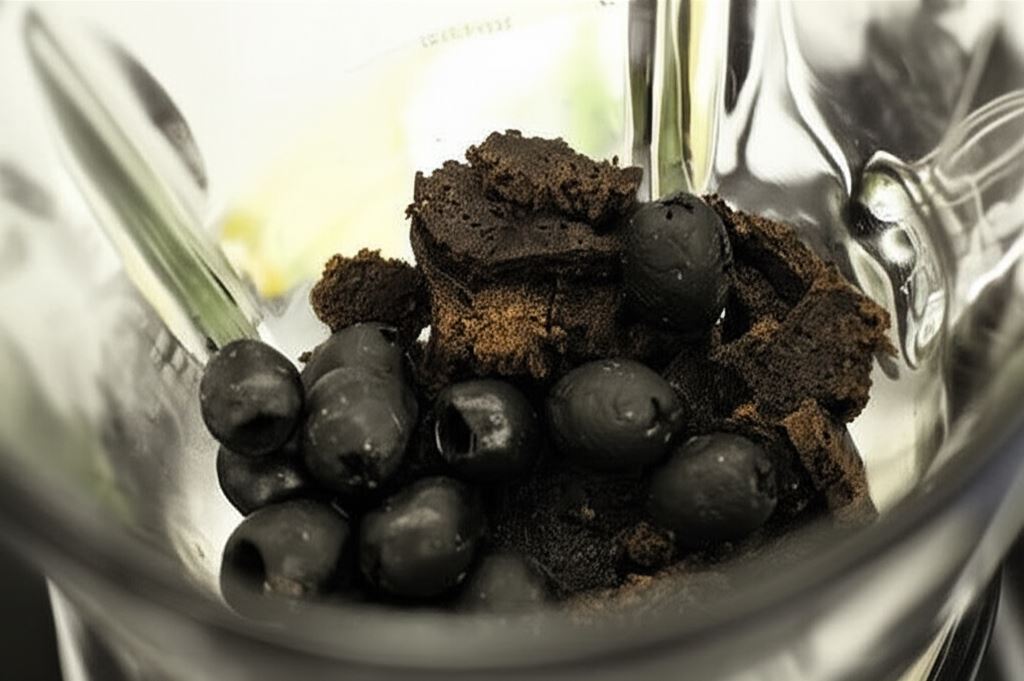 Posiekaj oliwki, umieść w piekarniku na 20 minut w temperaturze 160 stopni, by wyschły. Potem przełóż do miksera i zmiksuj razem z rozdrobnionym pumperniklem. Powinna utworzyć się czarna kruszonka.