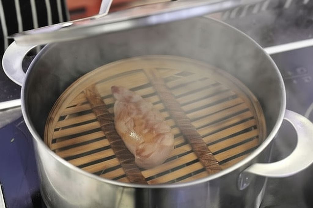W garnku umieść gałązki ziół i liście herbaty. Na ziołach umieść koszyczek do gotowania parowego. Połóż na nim obsmażone mięso, nakryj i rozpocznij podgrzewanie. Kiedy pojawi się pierwszy dym, zdejmij garnek z ognia i odstaw (nadal przykryty) na 10 minut. Po upływie tego czasu wyjmij mięso i obtocz w kruszonce.