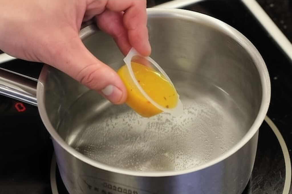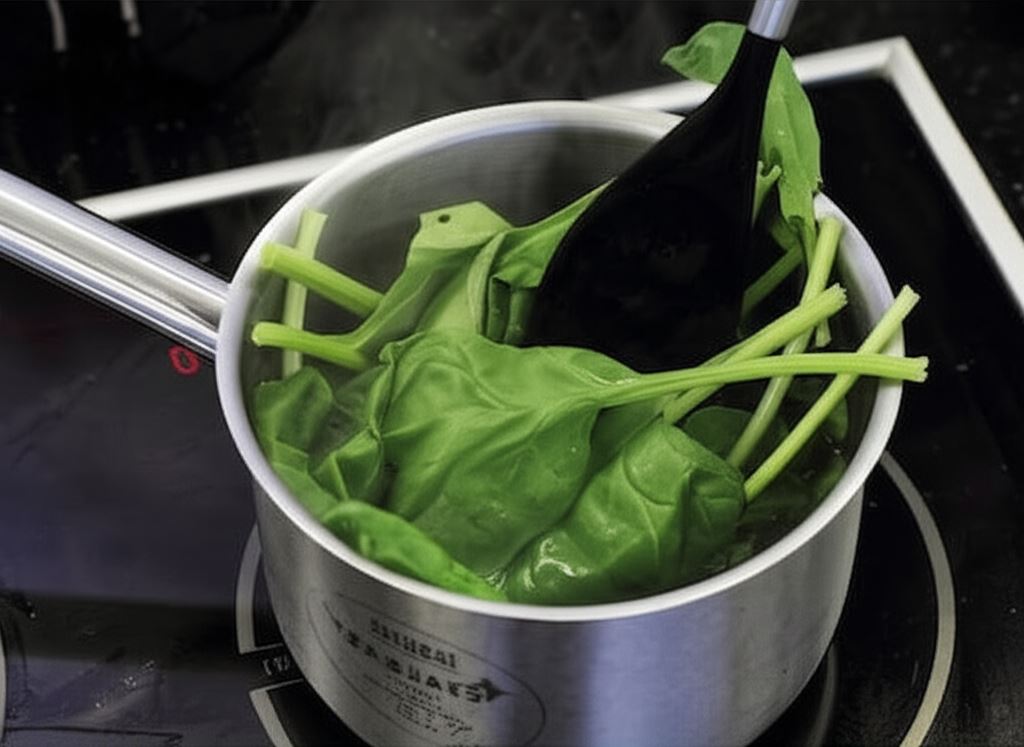 Doprowadź do wrzenia 500 mililitrów wody z bulionetką Knorr. Wrzątek z bulionem połącz blenderem z oczyszczonym szpinakiem, aby uzyskać zielony kolor. Przefiltruj przez sitko, a następnie ponownie zblenduj, by bulion był delikatnie spieniony.