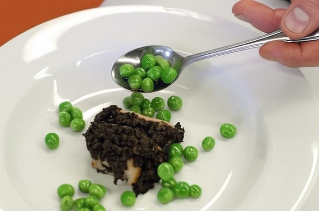 Na spodzie głębokiego talerza umieść plastry mięsa, obsyp ziarenkami zielonego groszku i dolej niewielką porcję zupy, zbierając łyżką również pianę powstałą w trakcie miksowania.