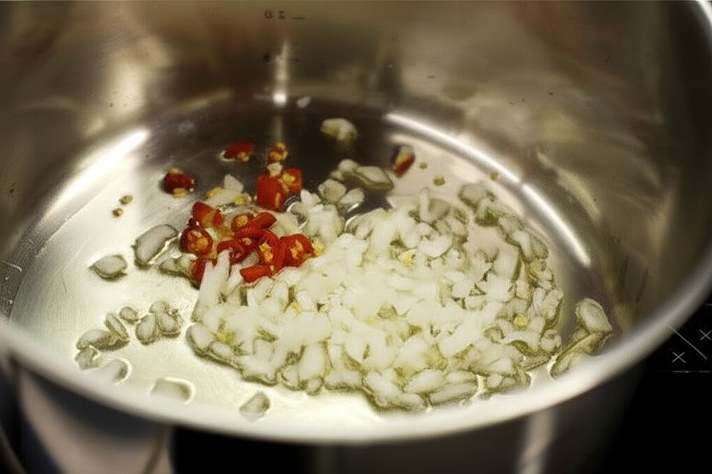 Cebule, czosnek i ostrą paprykę posiekaj w kostkę. Zrumień na oliwie w dużym garnku. Marchew, selera i pomidory także pokrój w kostkę, dorzuć do reszty warzyw i smaż przez moment.