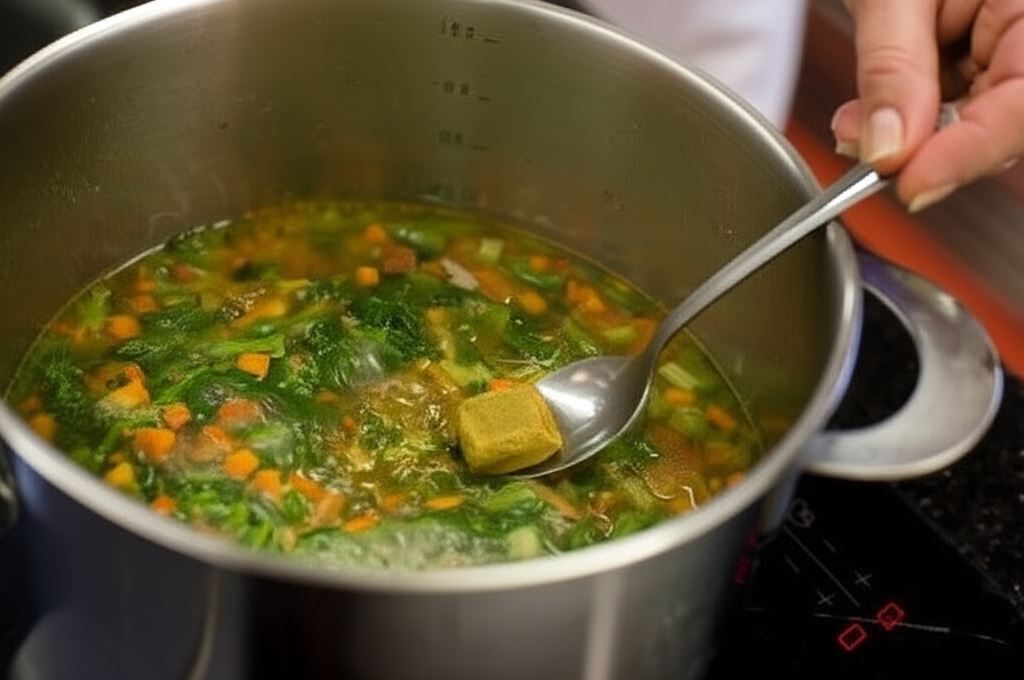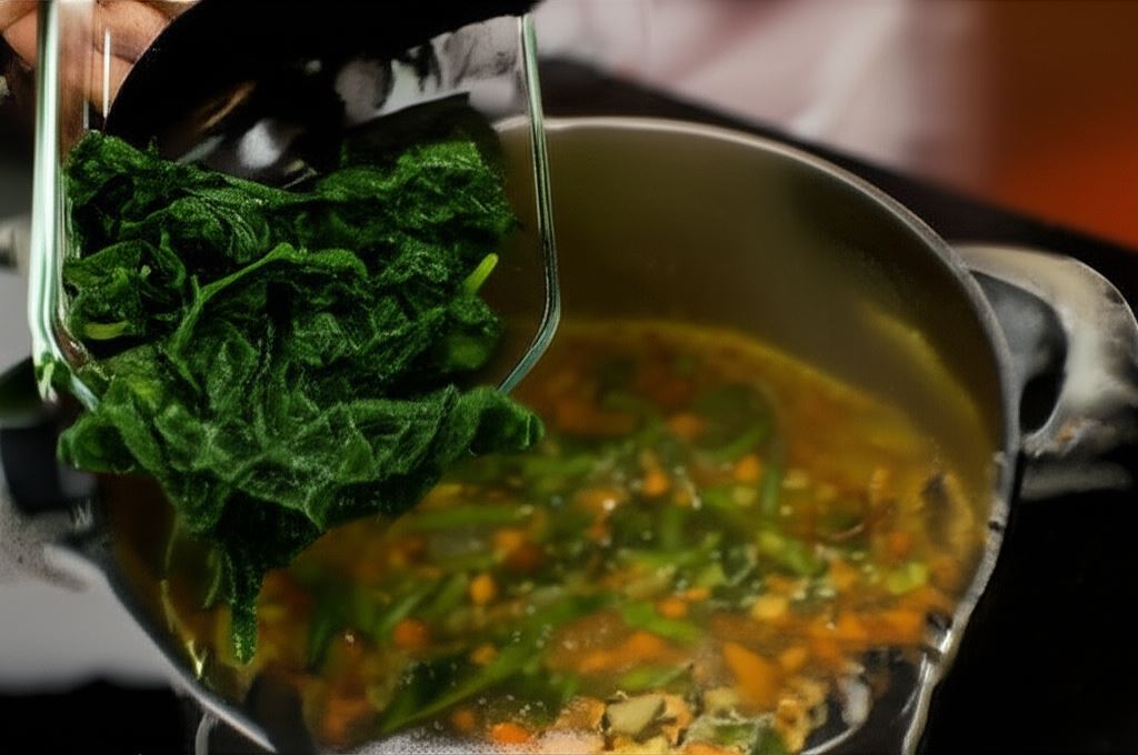 Doprowadź zupę do wrzenia. Na wolnym ogniu gotuj około 30 minut. Potem posiekaj liście bazylii i szpinaku, wrzuć do zupy razem z pozostałymi przyprawami (majerankiem, oregano i szałwią). Dodaj też 2 kostki Knorr.