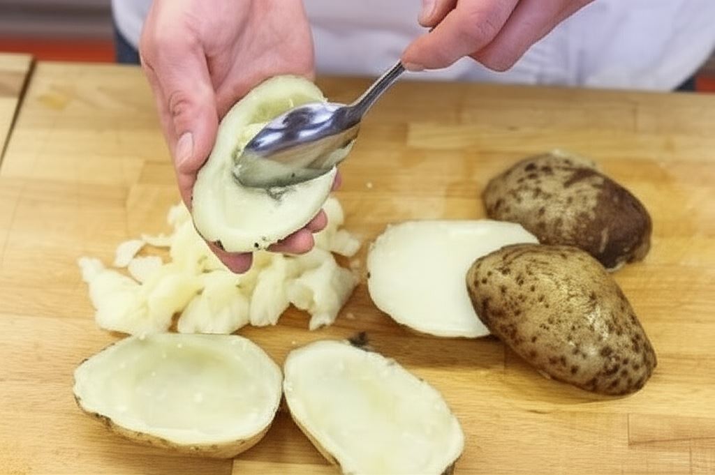 Przetnij ziemniaki wzdłużnie na połówki i wydrąż część miąższu, aby utworzyć łódeczki.