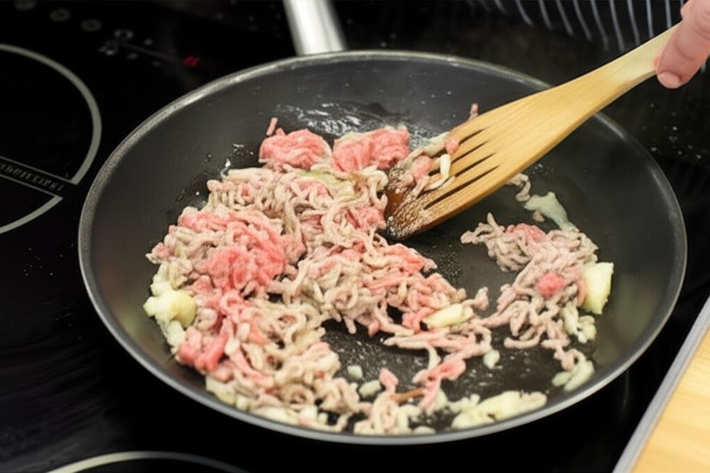 Na patelni zrumień posiekaną cebulę i czosnek. Po chwili wrzuć mięso i smaż około 8 minut.