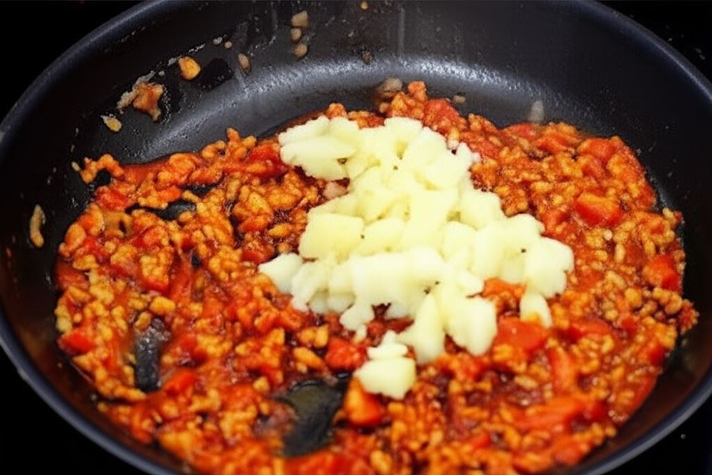 Potem dodaj do mięsa rozdrobnione pomidory z puszki wraz z sokiem oraz Knorr Naturalnie smaczne - Spaghetti Bolognese. Dodaj też pozostały miąższ z ziemniaków. Całość wymieszaj i smaż do zgęstnienia.
