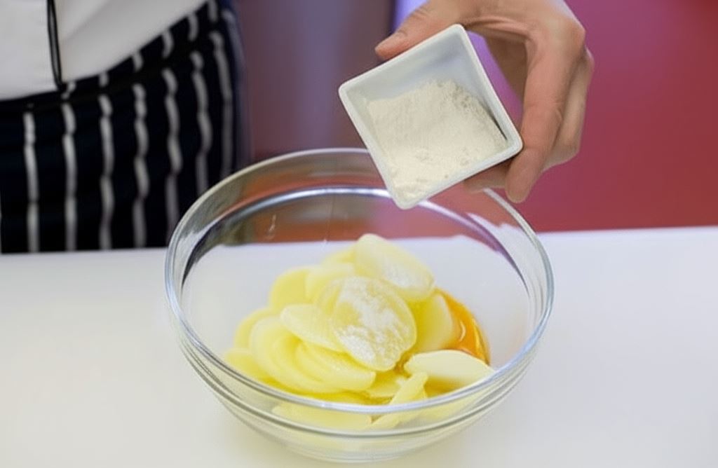 Kostkę przyprawową Knorr mini rozetrzyj z oliwą i wmieszaj do masy z ziemniaków.