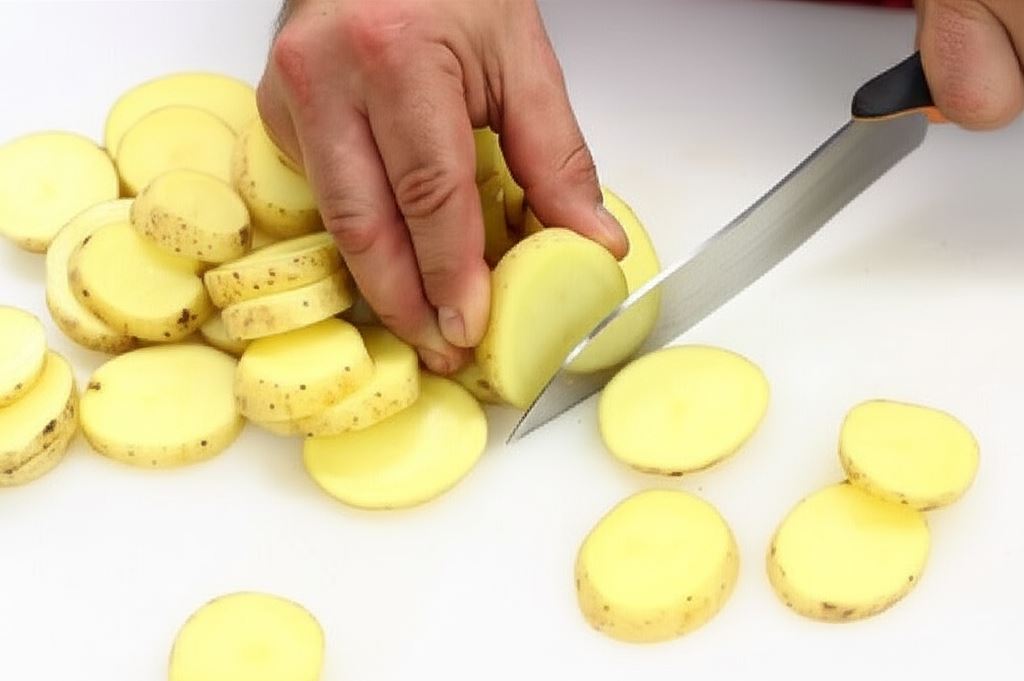 Ziemniaki starannie umyj i wysusz. Pokrój na plastry o grubości 0,5 cm. Czosnek posiekaj i razem z masłem dodaj do ziemniaków.