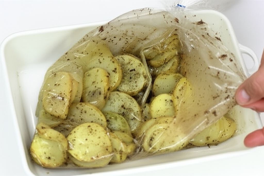 Przypraw ziemniaki majerankiem Knorr. Umieść w naczyniu żaroodpornym i zapiekaj w temperaturze 180 °C przez 30 minut.
