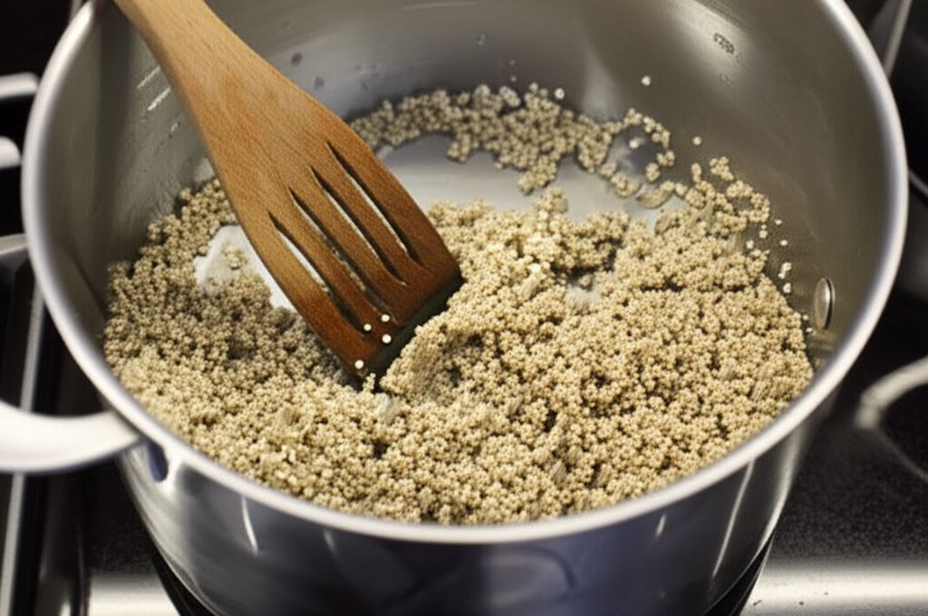 Kaszę przepłucz na sitku, potem delikatnie osusz i przyrumień w rondlu na oleju.