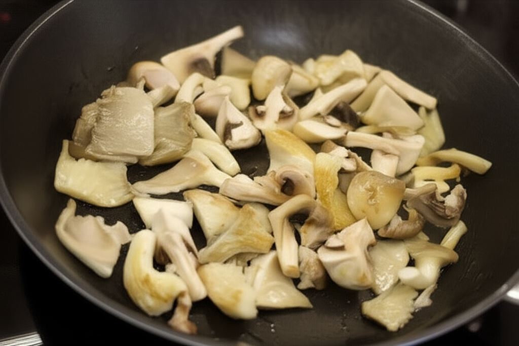 Boczniaki i pieczarki pokrój na większe kawałki i przysmaż na patelni.