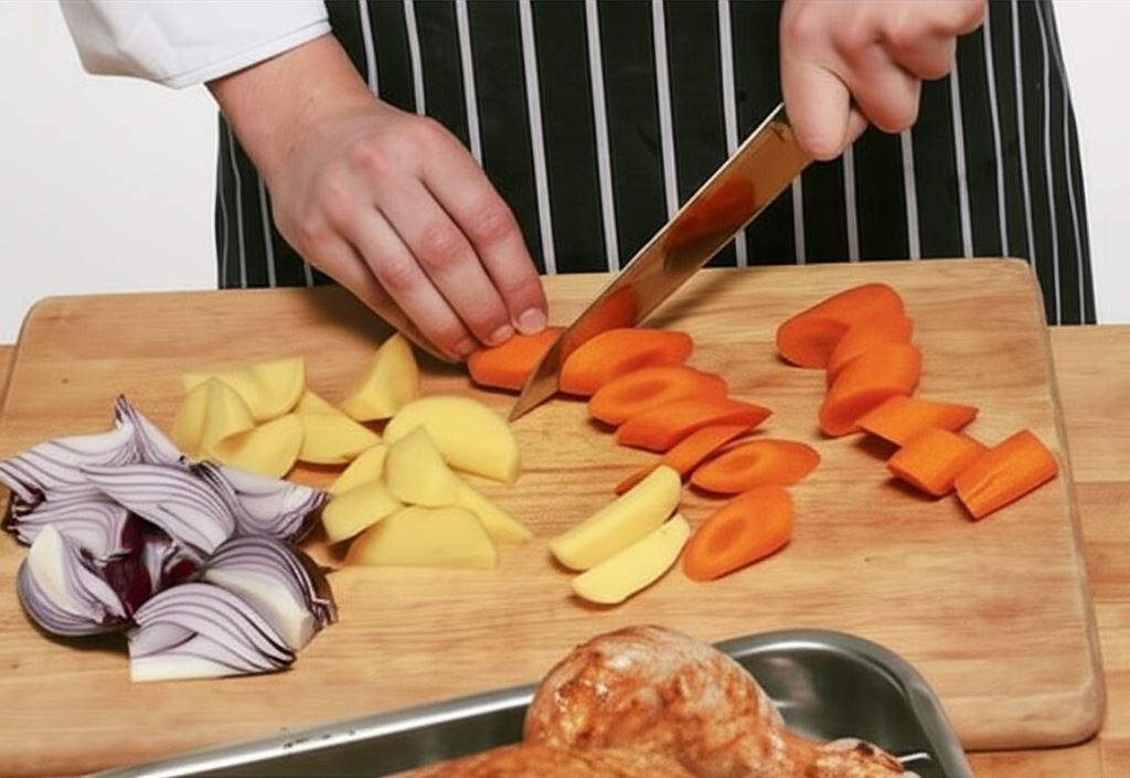 Obierz i pokrój ziemniaki na ćwiartki, marchewki podziel na grubsze krążki, cebule przekrój na cztery części. Połącz warzywa z resztą oliwy z oliwek oraz ziołami.