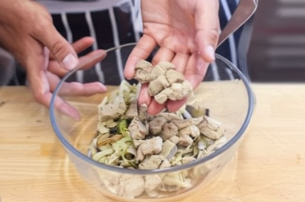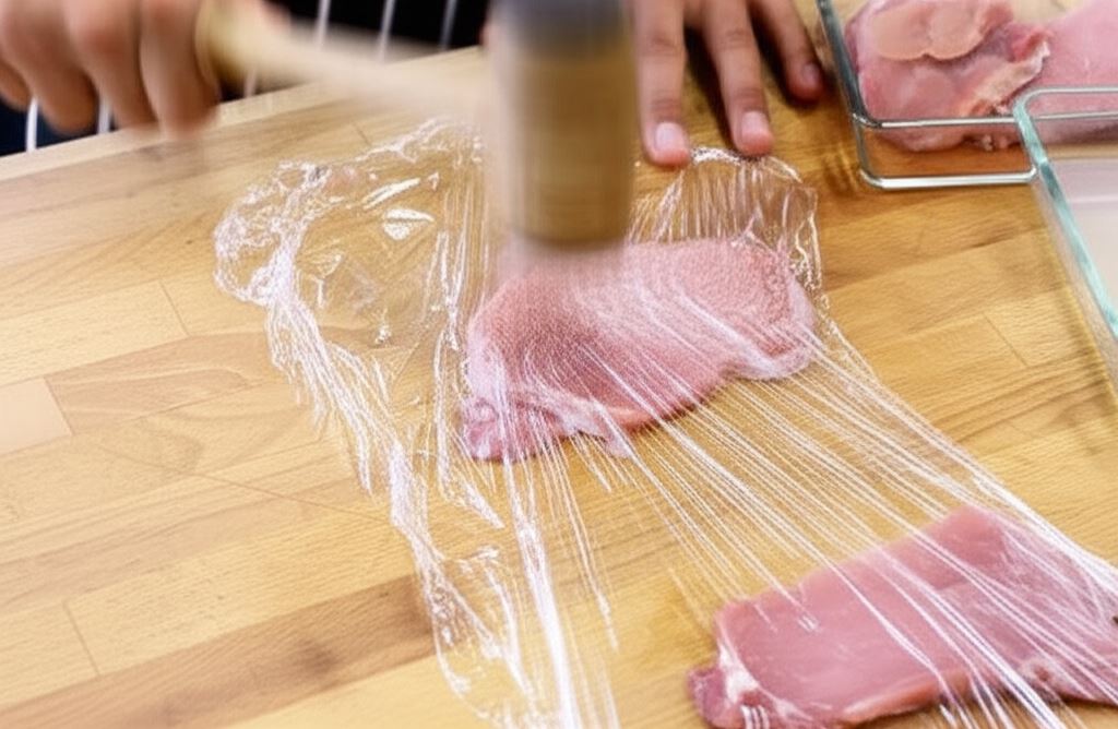 Mięso potnij na kotlety o grubości centymetra, umieść między dwiema warstwami folii i starannie rozbij na cienkie płaty. Mięso posyp przyprawą do mięs. Wątrobę pokrój na cienkie plastry. Plastry zalej wrzątkiem.