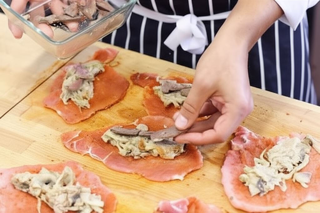 Na płaty mięsa nałóż odpowiednią porcję farszu, umieść kawałek wątroby, a całość zwiń zwijając uprzednio do środka boki. Zrazy zabezpiecz wykałaczką, by nie rozwinęły się w trakcie smażenia.