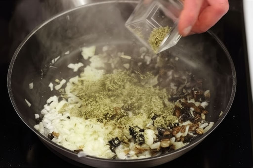 Grzyby zamocz i potnij na mniejsze części. Czosnek posiekaj. Cebulę pokrój w kostkę, zrumień na patelni, dorzuć grzyby i czosnek. Przypraw do smaku niewielką ilością majeranku, czarnym mielonym pieprzem oraz solą, jeżeli stwierdzisz, że jest to potrzebne.