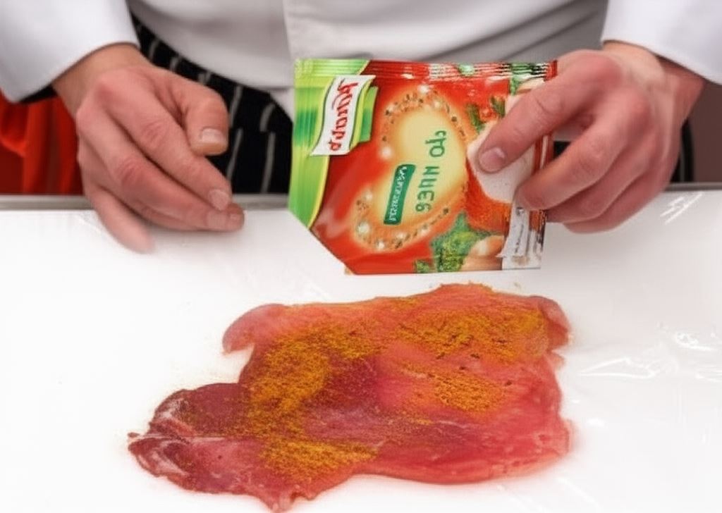 Mięso opłucz, wysusz, potnij w plastry i ubij tłuczkiem. Powierzchnię mięsa lekko posyp Przyprawą do mięs Knorr i pokryj musztardą.