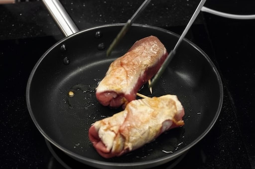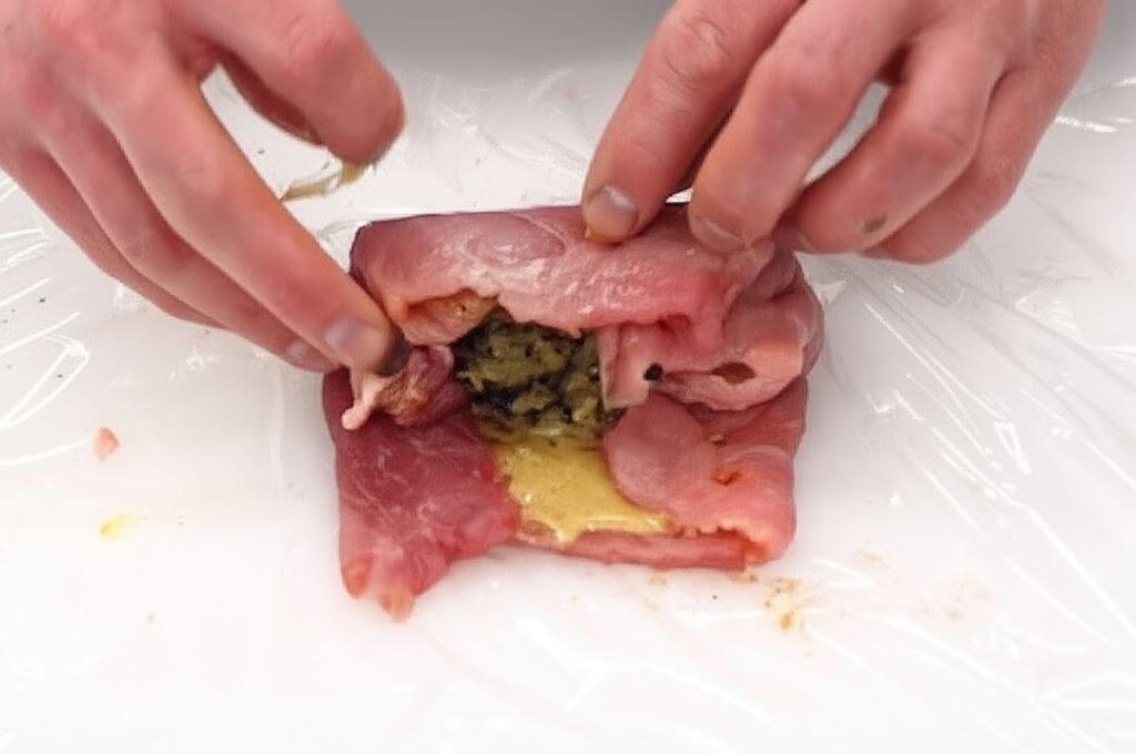 Na środku umieść porcję grzybów, brzegi mięsa złóż do środka. Całość dokładnie zwiń w rulon. Zrazy zabezpiecz wykałaczkami, by nie rozwinęły się w trakcie smażenia.